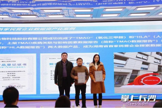 12月11日,长沙都正生物科技股份有限公司(以下简称“都正生物”)数据资产化成果在“激活数据要素潜能 助力数字湖南建设”研讨会发布。在湖南大数据交易所指导协助下,都正生物同时也成功完成了“TMAO”(氧化三甲胺)和“HLA”(人类白细胞抗原)的数据资产化工作,上架TMAO疾病关联与影响因素数据报告和HLA基因与药物和疾病关联数据报告两大数据产品,成为湖南省首家民营企业探索数据资产化的成功案例。